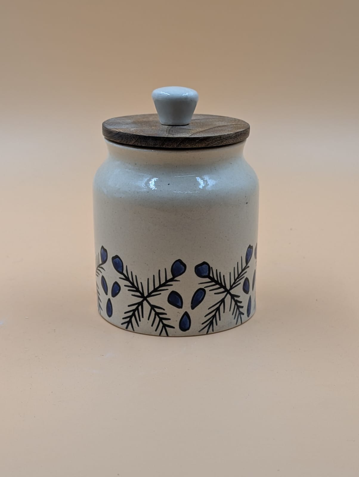 Airtight jar with wooden lid in pestle shade.