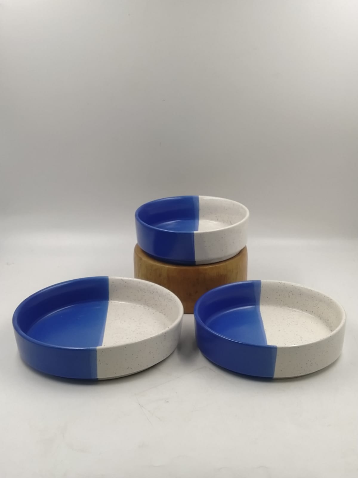 Set of 3 serving containers in white and blue half & half design. Best to serve salads.